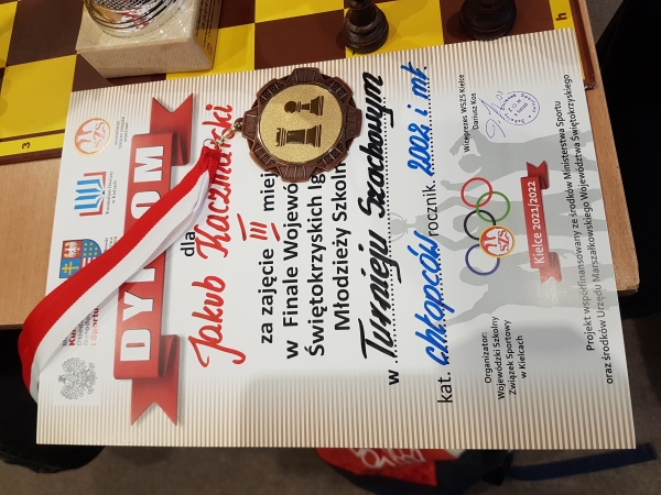 Turniej miał bardzo emocjonujący przebieg, o czym może świadczyć ostatnia z rozegranych partii naszego medalisty – Jakuba Kaczmarskiego. Kuba przed ostatnią rundą zgromadził 4 punkty i zdawał sobie sprawę z faktu, że tylko wygrana pozwoli mu włączyć się w walkę o podium. Trafił jednak na bardzo silnego zawodnika, który ostatecznie został mistrzem województwa. Po kilkunastu ruchach, doceniając klasę rywala, Kuba zaproponował remis, który jednak nie został przyjęty. Odmowa przeciwnika obudziła w naszym zawodniku ducha walki, więc zaczął on grać bardzo agresywnie i w zasadzie bezbłędnie. Po długich zmaganiach faworyzowany przeciwnik został zamatowany, co spotkało się z aplauzem licznych obserwatorów, którzy śledzili emocjonującą rozgrywkę. Na zegarach obu zawodników pozostało zaledwie po kilkanaście sekund, ale to nasz szachista okazał się zwycięzcą i zapewnił sobie tym samym 3. miejsce w turnieju!
