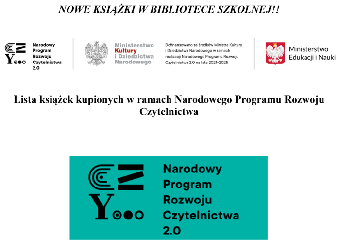 W ramach realizacji Narodowego Programu Rozwoju Czytelnictwa 2.0 w Zespole Szkół w Połańcu zostały zakupione nowe książki, których listę publikujemy poniżej.