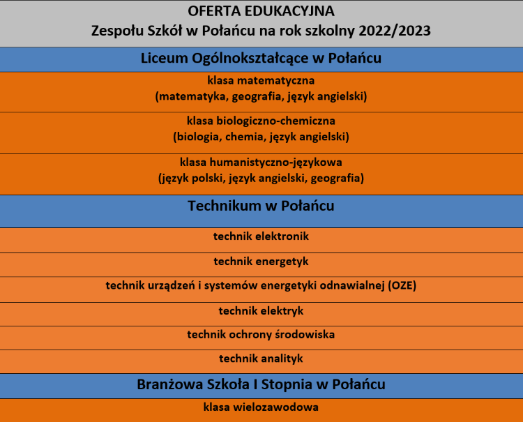 Szanowni Państwo, drodzy uczniowie! Pragniemy przedstawić ofertę edukacyjną na zbliżający się rok szkolny 2022/2023, jaką przygotował Zespół Szkół w Połańcu. Mamy nadzieję, że spełni ona Państwa oczekiwania. Więcej informacji można znaleźć na naszej stronie internetowej w zakładce „Dla kandydatów” oraz na szkolnym Facebooku. Zapraszamy!