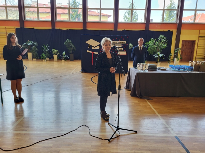 Następnie wystąpiła pani Bogusława Niespodziewana, sekretarz gminy Połaniec, która podziękowała za zaproszenie na uroczystość zakończenia roku szkolnego maturzystów i w imieniu burmistrza gminy, Jacka Nowaka, życzyła uczniom spełnienia marzeń nie tylko tych edukacyjnych, ale również życiowych, związanych z karierą zawodową i życiem osobistym.
