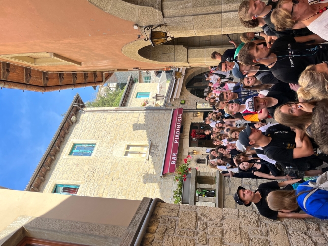 Przedostatni dzień uczniowie spędzili na plaży. Niektórzy zdecydowali się na kąpiel w Adriatyku. Po "naładowaniu akumulatorów” popołudnie ruszyliśmy do pierwszej na świecie republiki, czyli do San Marino. Ten pięknie położony kraj zamieszkuje zaledwie 34 tysiące osób. Wąskie uliczki i domy zbudowane z miejscowego piaskowa przez słynnych na cały świat kamieniarzy zrobiły na nas ogromne wrażenie. Ostatni wieczór w Cattolice uczniowie spędzili na eksplorowaniu kurortu. Po tym czekała nas „zielona noc” i 20 h powrotu przez niezliczoną ilość tuneli i wiaduktów. Punktualnie o 6 rano w wyborczy, niedzielny poranek młodzież zameldowała się w Połańcu, gdzie zakończyła się nasza włoska przygoda pod hasłem: „Z Ziemi Włoskiej do Polski”.