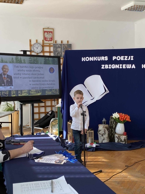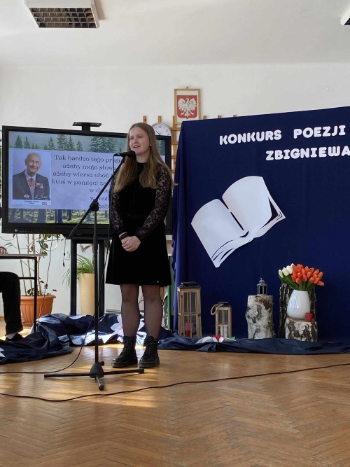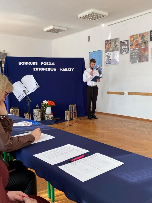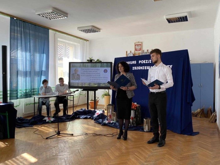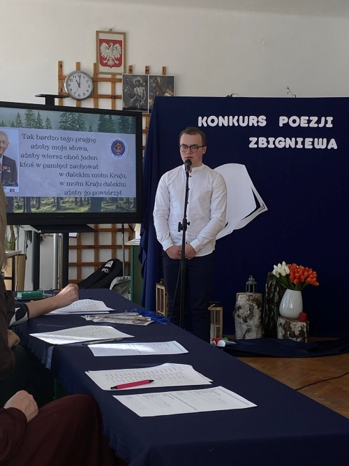 To właśnie tymi słowami Pani dyrektor Dorota Wysocka powitała uczestników, opiekunów oraz organizatorów Konkursu Recytatorskiego Poezji Zbigniewa Kabaty, który odbył się w auli Zespołu Szkół im. Oddziału Partyzanckiego AK „Jędrusie” w dniu 26.03.2024 r.