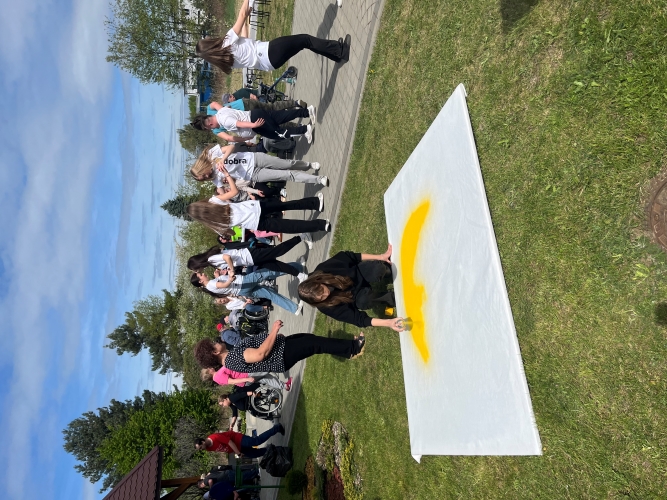Pogoda sprzyjała dzieleniu się dobrem i integracji, dlatego z przyjemnością spędzaliśmy czas na świeżym powietrzu, przy ognisku przygotowanym przez pracowników WTZ. Nie brakło integracyjnych tańców. Zwieńczeniem naszej wizyty było wspólne wykonanie pracy plastycznej, na której jedna z naszych wolontariuszek namalowała symbol Dnia Dobra - słońce, a wszyscy chętni uczestnicy spotkania odbili swoje dłonie na pamiątkę oraz jako znak integracji. Dobrym czynom towarzyszą dobre słowa, dlatego dla wszystkich przygotowaliśmy karteczki z pozytywnym przesłaniem i z przyjemnością obserwowaliśmy pojawianie się uśmiechów na twarzach obdarowanych. Skierowaliśmy je również do przedstawicieli Policji oraz społeczności szkolnej.