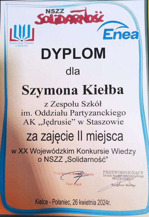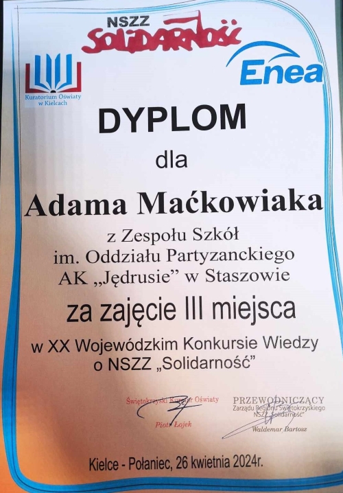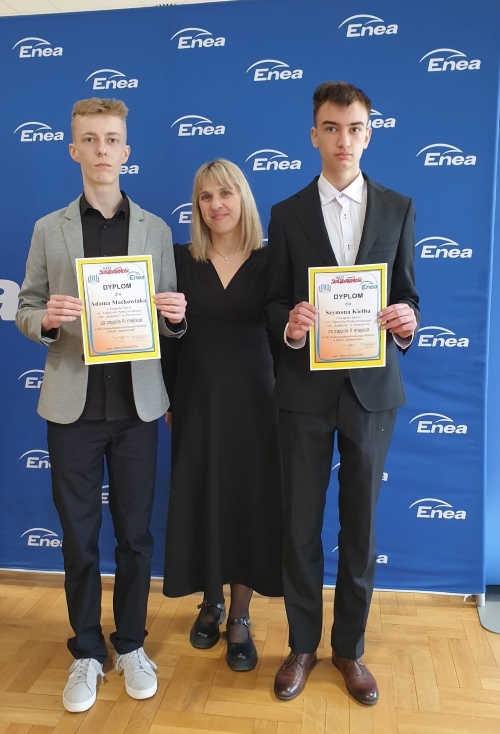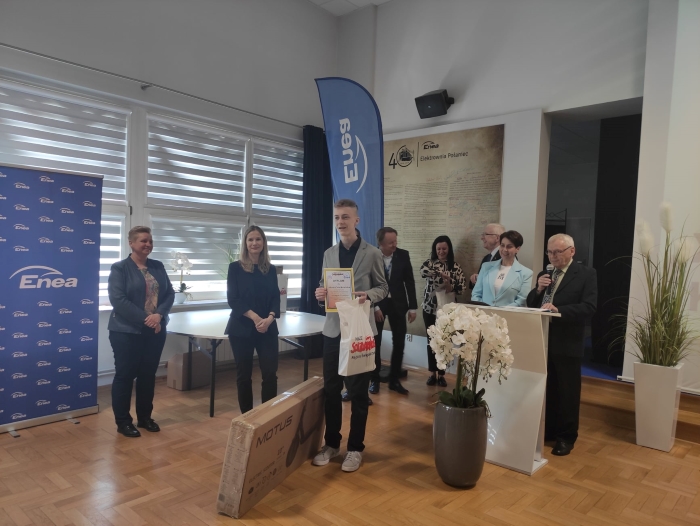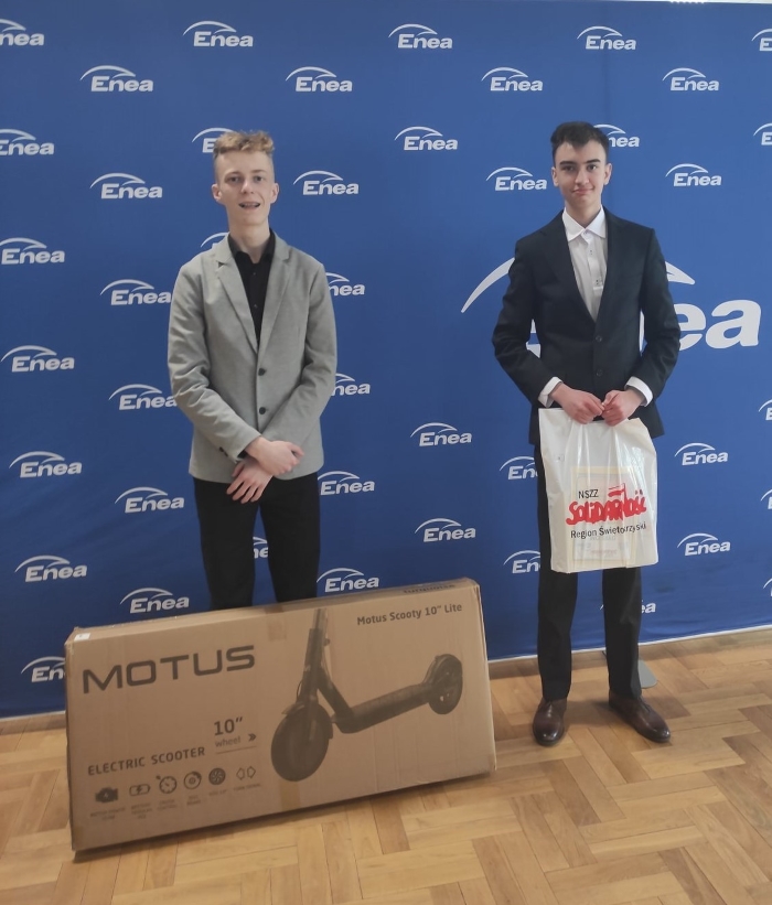 Wręczenie nagród laureatom odbyło się siedzibie Enea Elektrownia Połaniec SA w Zawadzie. Dwóch uczniów z naszej szkoły zostało nagrodzonych wartościowymi nagrodami. II miejsce zajął Szymon Kiełb. Nagrodzony został wysokiej jakości telefonem komórkowym, głośnikiem oraz ciekawymi publikacjami książkowymi. III miejsce zajął Adam Maćkowiak. Jego nagroda to hulajnoga elektryczna. Serdecznie gratulujemy! Dziękujemy również Adrianowi za trud włożony w przygotowanie do konkursu i udział w tymże wydarzeniu. Wierzę, że zdobyta wiedza zaprocentuje i pozwoli młodzieży lepiej zrozumieć proces transformacji ustrojowej oraz dzisiejszą rzeczywistość będącą efektem ciągłości procesów historycznych zgodnie z ideą: „Wszystko co jest, wyrasta z tego, co było”.