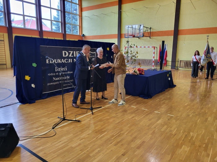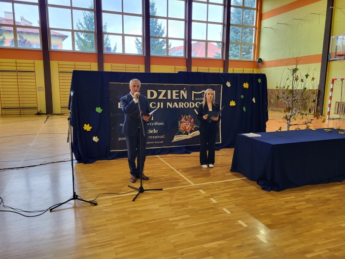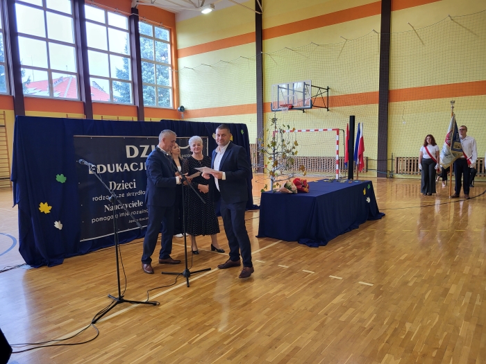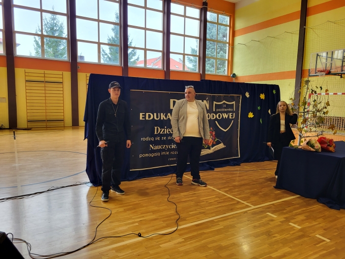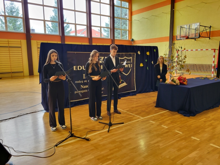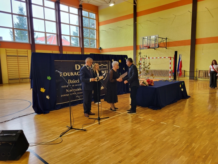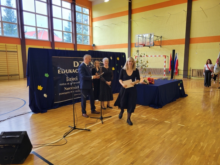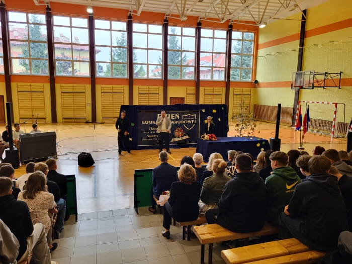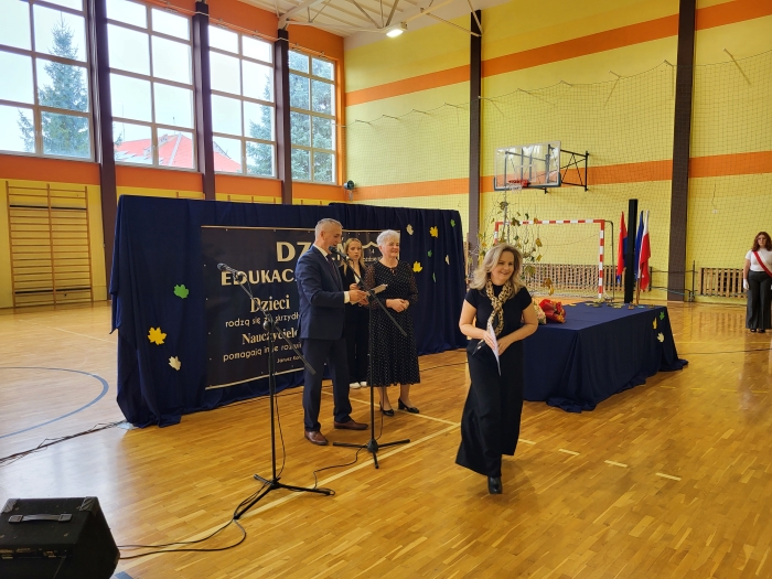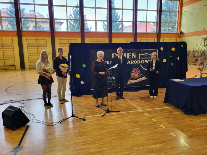 15 października w naszej szkole odbyła się uroczystość z okazji Dnia Edukacji Narodowej - niezwykła chwila dla całej społeczności szkoły. Uroczystość poprowadziła przewodnicząca szkoły Oliwia Wróbel. Na początku cała społeczność odśpiewała hymn narodowy. Przewodnicząca powitała wszystkich, a następnie zabrał głos dyrektor Stanisław Rogala, który mówił o trudnej, ale jakże pięknej pracy nauczyciela. Podziękował za dotychczasowe zaangażowanie oraz życzył wielu sił i wytrwałości w tym wyjątkowym zawodzie. Życzenia i podziękowania za trud pracy nauczycielskiej popłynęły również od przewodniczącej Rady Rodziców, pani Ewy Tałaj, która złożyła kwiaty na ręce dyrekcji.