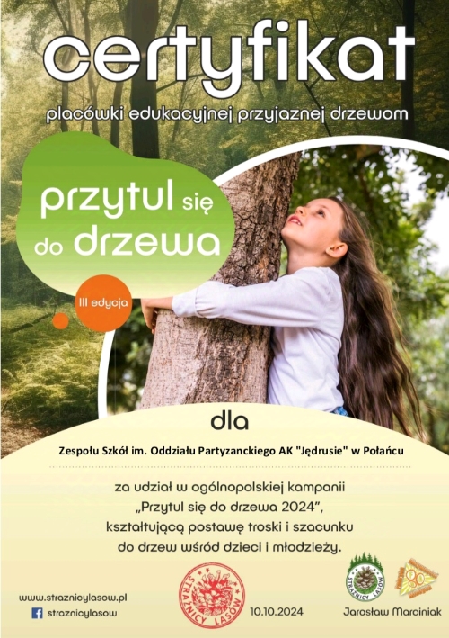 We wrześniu 2024 roku uczniowie klas pierwszej i drugiej technikum ochrony środowiska wraz z Panią Justyną De Luca oraz Panią Beatą Kubik wzięli udział w III edycji ogólnopolskiej kampanii "Przytul się do drzewa 2024". Zorganizowaną grupą wyruszyliśmy w teren, by zrealizować postanowienie akcji, w której należało wykonać zdjęcie indywidualne lub grupowe na którym w ramach kampanii przytulamy drzewo. Wykonane zdjęcia zostały wysłane do organizatorów kampanii - Strażnicy Lasów. W ramach podziękowania za udział w akcji szkoła, opiekunowie i uczniowie biorący udział otrzymali dyplomy i certyfikaty.