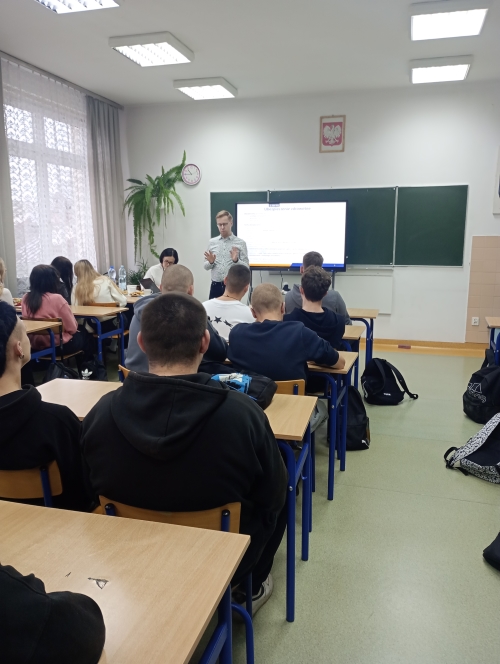 8 stycznia uczniowie klas czwartych liceum i technikum wzięli udział w spotkaniu zorganizowanym w ramach projektu „18+ Zdrowie”. Spotkanie poprowadzili pracownicy Narodowego Funduszu Zdrowia z Kielc, Pani Dagmara Borowiec, oraz Pan Piotr Dudek. Celem projektu było zapoznanie młodzieży z podstawowymi zagadnieniami na temat powszechnego ubezpieczenia zdrowotnego – ich praw i obowiązków związanych z ubezpieczeniem zdrowotnym z chwilą osiągnięcia pełnoletności. Prelekcja dotyczyła także tematów: profilu zaufanego – możliwości jego założenia i korzyści wynikających z jego posiadania, Internetowego Konta Pacjenta, uczestnicy poznali sposoby założenia Europejskiej Karty Ubezpieczenia Zdrowotnego. Ponadto poznali ciekawe programy i aplikacje opracowane przez NFZ takie jak: portal Diety NFZ, aplikacja 8 Tygodni do zdrowia, program Moje Fizjo+ i dowiedzieli się, w jaki sposób należy z nich korzystać. Dziękujemy prelegentom za przygotowanie bardzo ciekawego i bogatego merytorycznie wykładu, który na pewno ułatwi młodym osobom poruszanie się w systemie ochrony zdrowia.