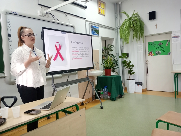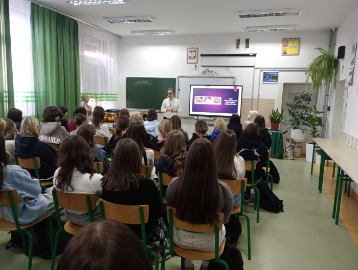 12 lutego 2025 w naszej szkole odbyły się zajęcia warsztatowe, w których wzięli udział uczniowie klas drugich i trzecich liceum i technikum. Spotkanie poprowadziła Pani Katarzyna Majka, specjalistka do spraw promocji zdrowia i edukator ze Świętokrzyskiego Centrum Onkologii w Kielcach. Przedsięwzięciu przyświecała idea zwiększenia poziomu wiedzy na temat profilaktyki raka szyjki macicy i raka jąder, roli wirusa HPV w powstawaniu raka szyjki macicy, podniesienie świadomości o czynnikach zwiększających ryzyko nowotworów szyjki macicy i jąder. Uczestnicy spotkania zostali podzieleni na dwie grupy. Dziewczęta wysłuchały wykładu na temat raka szyjki macicy: jego objawów, przyczyn powstawania, leczenia oraz zapobiegania. Natomiast chłopcy poznali czynniki ryzyka powstawania raka jąder, sposoby zapobiegania oraz dowiedzieli się, jak prawidłowo wykonywać samobadanie. Zajęcia cieszyły się zainteresowaniem wśród uczestników, a poruszona tematyka przyczyniła się do zwiększania świadomości onkologicznej uczniów i zmotywowania młodzieży do regularnego poddawania się badaniom profilaktycznym. Dziękujemy Pani edukator za poprowadzenie ciekawych zajęć i jednocześnie liczymy na dalszą współpracę.