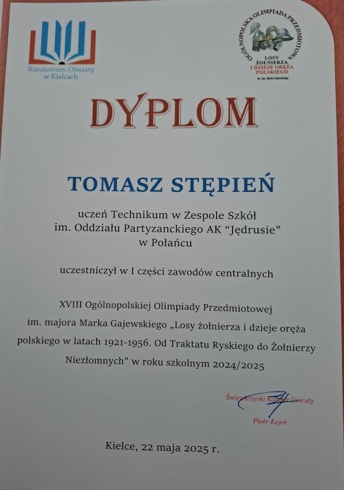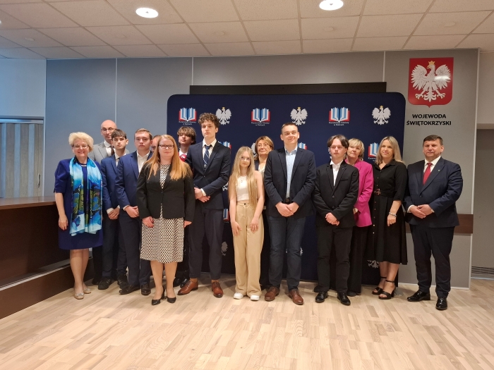 22 maja 2025 r. laureaci i finaliści konkursu historycznego "Losy żołnierza i dzieje oręża polskiego im. majora Marka Gajewskiego" mieli zaszczyt odebrać z rąk Pani Grażyny Dekiel, Świętokrzyskiej Wicekurator Oświaty, nagrody i dyplomy. W tym zacnym gronie znalazł się uczeń naszego technikum - Tomasz Stępień. Podczas uroczystości uczniowie usłyszeli wiele miłych słów z ust Pana Michała Skotnickiego – Wicewojewody Świętokrzyskiego, Pana Roberta Piwko – naczelnika Delegatury Instytutu Pamięci Narodowej oraz Pani Grażyny Dekiel, Świętokrzyskiej Wicekurator Oświaty. Finaliści i laureaci zostali nagrodzeni pamiątkowymi dyplomami oraz otrzymali nagrody książkowe. Był to niezwykle wzruszający moment dla zgromadzonych uczniów, ich rodziców ale również nauczycieli którzy przyczynili się do sukcesu swoich podopiecznych. Gratulujemy wszystkim nagrodzonym i wyróżnionym oraz życzymy dalszych sukcesów.