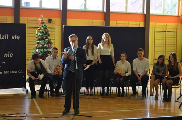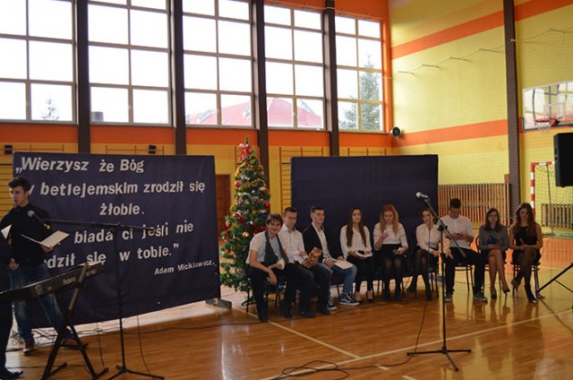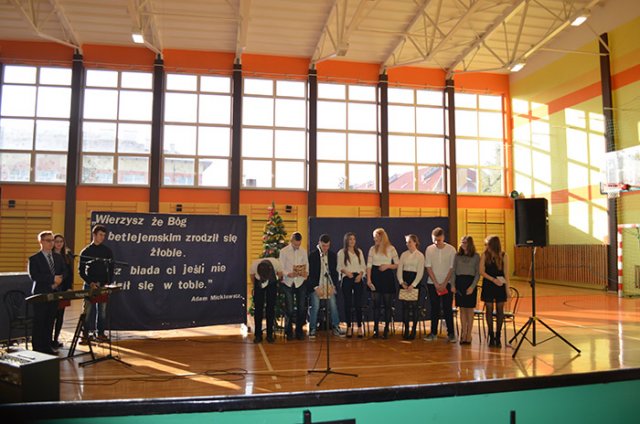 Najważniejszym wydarzenia tego dnia były przygotowane przez uczniów jasełka, których pomysłodawcą i organizatorem był ksiądz Adrian Morgaś. O oprawę muzyczną zadbał – jak zwykle – mgr Zbigniew Brzeski. Młodzież znakomicie się zaprezentowała, a na szczególne uznanie zasłużyli Patrycja Strzałka (kl. III „c” LO) i Bartosz Gajdowski (IV „a” T), którzy w duecie dali wspaniały koncert polskich kolęd.