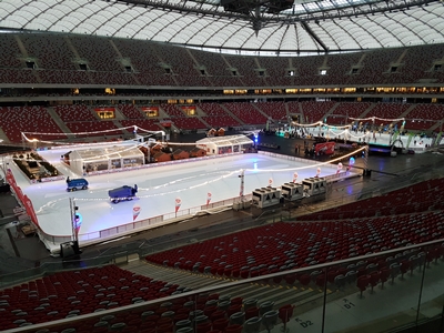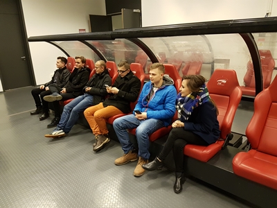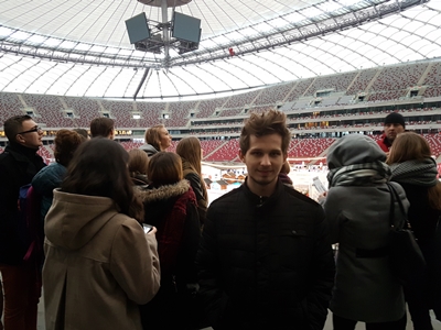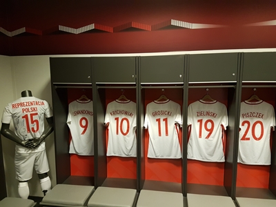 Następnym etapem wycieczki była wizyta na Stadionie Narodowym. Mimo niesprzyjających warunków atmosferycznych (nieustanna ulewa) obiekt zrobił na nas piorunujące wrażenie. Chyba nikt z nas nie spodziewał się, że jest tak ogromny i nowoczesny. Zaopiekował się nami przewodnik, który oprowadził nas po najciekawszych miejscach. Największy chyba entuzjazm wśród uczestników wzbudziły loże dla vip-ów oraz szatnie zawodników, choć widok z najwyższych rzędów obiektu był też niezapomniany.