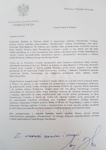 Nasza placówka - jak wiele innych instytucji w Polsce - od lat bierze czynny udział w akcji Narodowego Czytania, której patronuje Prezydent Rzeczypospolitej Polskiej. W tym roku kancelaria Prezydenta RP Andrzeja Dudy przesłała nam oficjalne podziękowanie za udział w Narodowym Czytaniu "Przedwiośnia", a także upominki w postaci pamiątkowego wydania dzieła Stefana Żeromskiego i miodowego ciastka w barwach narodowych, o kształcie odwzorowującym granice naszego kraju. Serdecznie dziękujemy - czujemy się wyróżnieni!