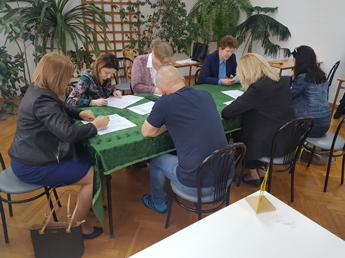 Konkurs rozpoczął się od rejestracji uczestników. Już przed godziną 9:00 dotarły do nas pierwsze trzyosobowe zespoły uczniów wraz z opiekunami, a w sumie przybyło ich aż 17, co przy trudnych warunkach pogodowych, jakie zaistniały w ostatnich dniach, jest wynikiem rewelacyjnym; pokazującym, że Konkurs cieszył się dużym zainteresowaniem. Już po kilkunastu minutach, zgodnie z przyjętym harmonogramem, gościliśmy więc 51 zawodników – uczniów szkół z dwóch powiatów: staszowskiego i mieleckiego. Każdy z uczniów został zarejestrowany, otrzymując przy tym specjalną naklejkę do wykorzystania podczas kodowania pracy.
