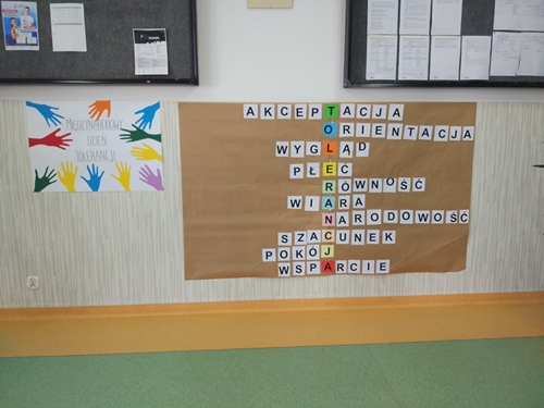 Samorządowi dekoratorzy pod opieką p. Jolanty Gach przygotowali krzyżówkę, nawiązującą do tego niezwykle istotnego pojęcia, jakim jest tolerancja. Każdy uczeń i nauczyciel mógł przykleić kartkę z odpowiedzią na pytanie, czym tak właściwie jest dla niego tolerancja. Zaprosiliśmy również panie psycholog: Danutę Sobolewską i Anetę Olszewską z pobliskiej Filii Publicznej Poradni Psychologiczno-Pedagogicznej w Staszowie, które przybliżyły wszystkim zgromadzonym istotę tej postawy oraz zaprezentowały proste przykłady jej życiowego użycia.