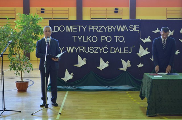 Przemawiał też przedstawiciel lokalnej władzy, Pan Jacek Nowak, członek Rady Powiatu Staszowskiego, który przekazał zebranym życzenia z okazji rozpoczynającego się roku szkolnego od Starosty Staszowskiego, Pana Michała Skotnickiego.