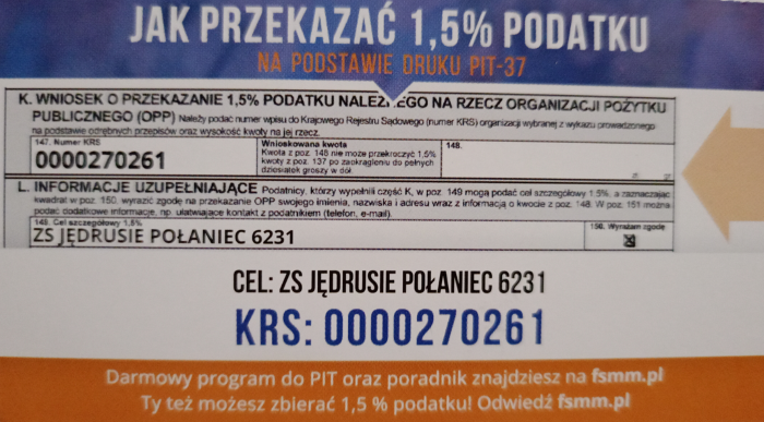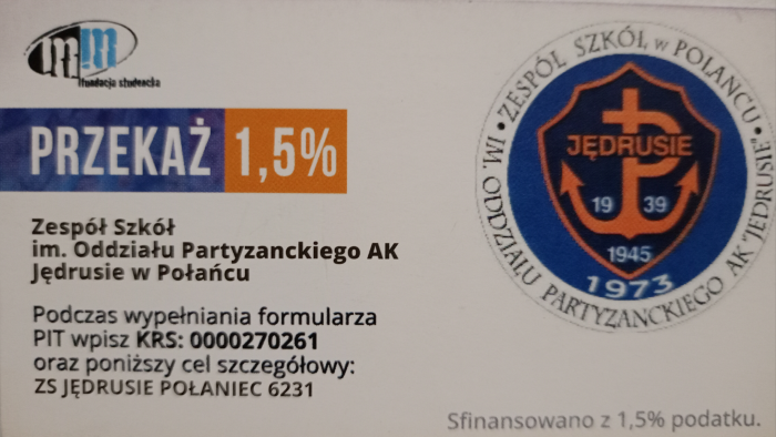 Zachęcamy wszystkich przyjaciół naszej szkoły do przekazywania nam 1,5% swojego podatku.