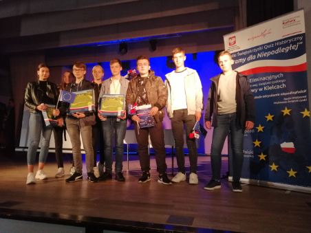 20 września 2019 r. w Staszowskim Ośrodku Kultury odbył się Wielki Świętokrzyski Quiz Historyczny pn. "Gramy dla Niepodległej". Ideą quizu było zwiększenie świadomości obywatelskiej i historycznej młodych Polaków przy wykorzystaniu współczesnych zdobyczy technologicznych. Quiz skierowany był do uczniów ze świętokrzyskich szkół podstawowych (7 i 8 klasa) i ponadpodstawowych. Jego celem było m.in: uczczenie święta 100. rocznicy odzyskania przez Polskę niepodległości oraz ukazanie pozytywnych aspektów członkostwa Polski w UE. W quizie wzięło udział 32 zespoły , w tym również nasza szkoła, reprezentowana przez 2 zespoły trzyosobowe: LO - Oliwia Jabłońska (kl. Ib), Kacper Wysocki (kl. Ia), Władysław Głowacki (kl. 1c), TE - Paweł Bednarski, Bartłomiej Czosnek, Łukasz Wiącek (kl. 1 a).