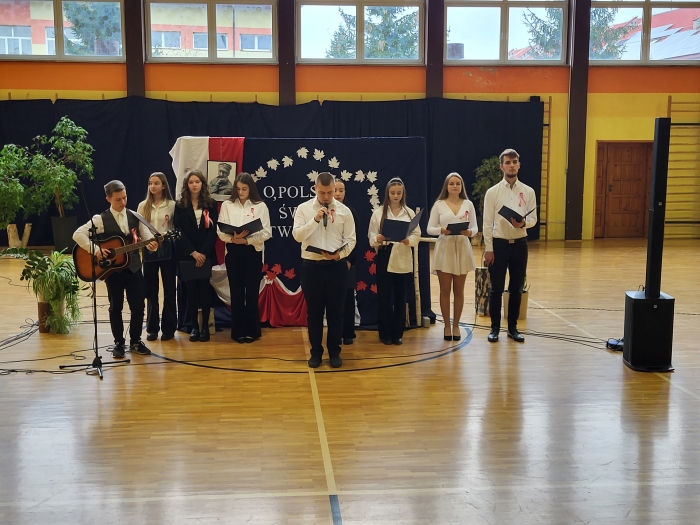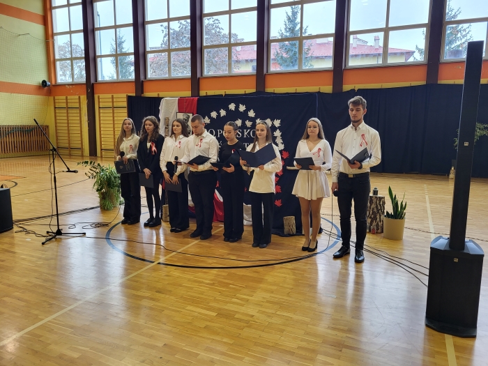 14 listopada uczniowie Zespołu Szkół im. Oddziału Partyzanckiego AK "Jędrusie" w Połańcu po raz kolejny zwrócili uwagę na to, iż od 104 lat możemy żyć w wolnej i suwerennej Polsce, która na długie lata zniknęła z mapy Europy. Montaż słowno-muzyczny, przygotowany pod kierunkiem pań Iwony Czosnek i Elżbiety Gałek, miał na celu uczczenie pamięci tych, którzy w imię wolności złożyli swoje życie na ołtarzu Ojczyzny. Poprzez poezję i pieśni ukazano jakże bogatą, przepełnioną bólem i cierpieniem historię naszego kraju. Oprawę uroczystości stanowiła utrzymana w duchu patriotycznym dekoracja, przygotowana pod kierunkiem pani Anny Nowakowskiej.