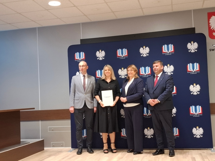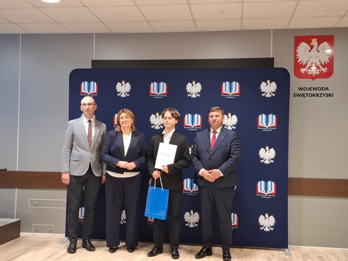 22 maja 2025 r. laureaci i finaliści konkursu historycznego "Losy żołnierza i dzieje oręża polskiego im. majora Marka Gajewskiego" mieli zaszczyt odebrać z rąk Pani Grażyny Dekiel, Świętokrzyskiej Wicekurator Oświaty, nagrody i dyplomy. W tym zacnym gronie znalazł się uczeń naszego technikum - Tomasz Stępień. Podczas uroczystości uczniowie usłyszeli wiele miłych słów z ust Pana Michała Skotnickiego – Wicewojewody Świętokrzyskiego, Pana Roberta Piwko – naczelnika Delegatury Instytutu Pamięci Narodowej oraz Pani Grażyny Dekiel, Świętokrzyskiej Wicekurator Oświaty. Finaliści i laureaci zostali nagrodzeni pamiątkowymi dyplomami oraz otrzymali nagrody książkowe. Był to niezwykle wzruszający moment dla zgromadzonych uczniów, ich rodziców ale również nauczycieli którzy przyczynili się do sukcesu swoich podopiecznych. Gratulujemy wszystkim nagrodzonym i wyróżnionym oraz życzymy dalszych sukcesów.