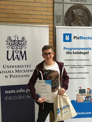 Jak już można było przeczytać na szkolnej stronie, Dawid Cichoń, uczeń klasy IV a Technikum w Połańcu, czyli technik elektronik, wziął udział w konkursie Pix Programming Challenge. Pomyślnie przeszedł eliminacje i zakwalifikował się półfinałów, które odbyły się on-line 5 grudnia w szkolnej pracowni. Również ten etap zakończył się sukcesem i na 490 startujących w półfinale Dawid zakwalifikował się do finału konkursu, który odbył się w pracowniach komputerowych Wydziału Matematyki i Informatyki Uniwersytetu im. Adama Mickiewicza w Poznaniu 13 XII 2019 r. Po wykładzie wstępnym pana dra Krzysztofa Krzywdzińskiego uczestnicy wszystkich 3 kategorii zostali zaproszeni do pracowni. Po zalogowaniu się na stronie konkursu https://pixchallenge.org/konkurs/ i sprawdzeniu wersji języka Python rozpoczęły się właściwe zawody.
