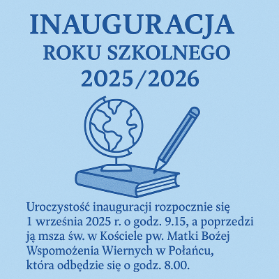 Dyrekcja, Grono Pedagogiczne oraz Samorząd Uczniowski Zespołu Szkół w Połańcu serdecznie zapraszają na uroczystość inauguracji roku szkolnego 2025/2026, która odbędzie się 1 września 2025 r. o godzinie 9:15 w sali gimnastycznej naszej szkoły.