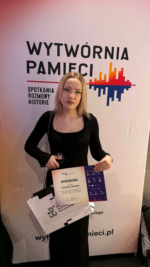 Z ogromną radością informujemy, że Vitoria Nowak, uczennica klasy IV „B” Liceum Ogólnokształcącego, otrzymała wyróżnienie za przygotowany film z udziałem pana Mirosława Pardeli, 87-letniego mieszkańca Skarżysko-Kamienna. W swoim materiale uczennica w poruszający sposób przedstawiła wspomnienia seniora, oddając atmosferę tamtych lat oraz emocje towarzyszące przeżytym wydarzeniom.