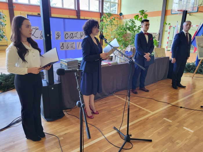 Po części oficjalnej przyszedł czas na występy artystyczne. Aplauz wywołał znakomity występ taneczno-akrobatyczny tria dziewcząt z klasy I A LO. Po tańcu przyszedł czas na śpiew, w którym prym wiedli uczniowie z niezawodnej IV AD naszego technikum, wspomagani przez liczne grono wokalistek. Uroczystość znakomicie poprowadzili konferansjerzy - Oliwia Wróbel z II AC LO i Paweł Bednarski z IV AD T.