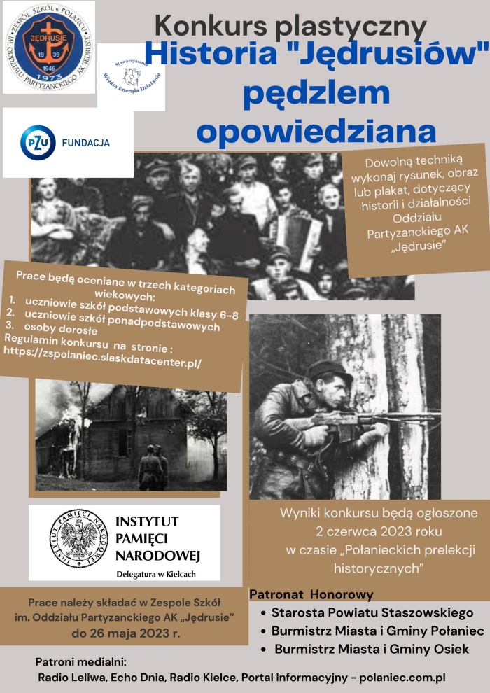 Zapraszamy wszystkich chętnych do udziału w konkursie plastycznym, stanowiącym element projektu "Połanieckie prelekcje historyczne", w efekcie którego powstał w naszej szkole wyjątkowy mural. Jego inicjatorem jest Stowarzyszenie Wiedza Energia Działanie, wspierane przez Fundację PZU. Patronat nad projektem objęła Izba Pamięci Narodowej, a honorowy patronat nad tym przedsięwzięciem sprawują Starosta Powiatu Staszowskiego, Burmistrz Miasta i Gminy Połaniec oraz Burmistrz Miasta i Gminy Osiek. Przypominamy, że już 2 czerwca 2023 r. odbędą się w naszej szkole prelekcje historyczne, wtedy też nastąpi oficjalne odsłonięcie muralu.