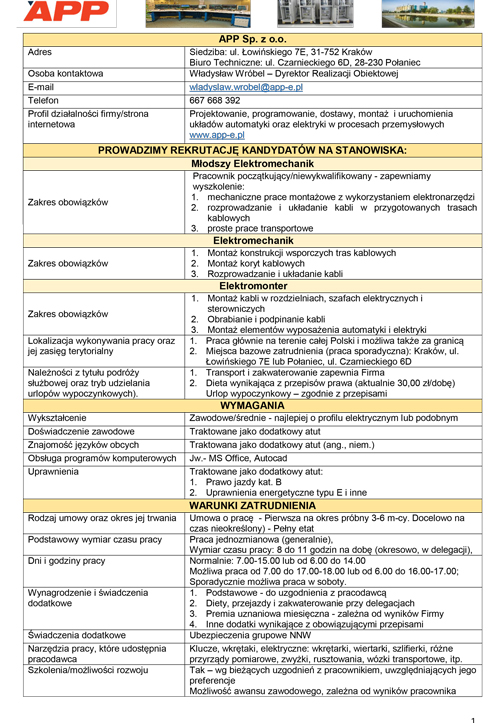 Przedstawiamy firmę APP Sp. z o.o. Zachęcamy do przejrzenia oferty dla tegorocznych absolwentów. Uczniowie klas młodszych też powinni zapoznać się z wymaganiami jakie stawiają pracodawcy nowym pracownikom. Jest to bardzo ciekawa oferta ponieważ oddział firmy znajduje się w Połańcu na ulicy Czarnieckiego 6D.